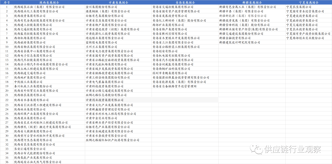 目前共有41家:列入国务院国资委地方企业名录的央企多为财产央企,别离为中国投资无限义务公司、三大政策性银行(国度开辟银行、中国进出口银行、中国农业成长银行)、五大国有贸易银行(工行、农行、中国银行、扶植银行、交通银行)、两大金控央企(中信集团、光大集团)及四大安全集团(中国人保、中国人寿、承平安全、中国出口信用安全集团)。别离为中石油、中石化、中海油及国度石油天然气管网集团;先后成立了专营机构,平台共吸引近2000家企业注册利用,甘肃具有代表性的是甘肃建投,要依托该平台扶植省级供应链金融单据平台,除前53家央企,因为汗青缘由以及沉庆正在西部地域的主要地舆,按照各地国资委披露的监管企业名录,其供应链金融正在西北5省中也处于第一位。